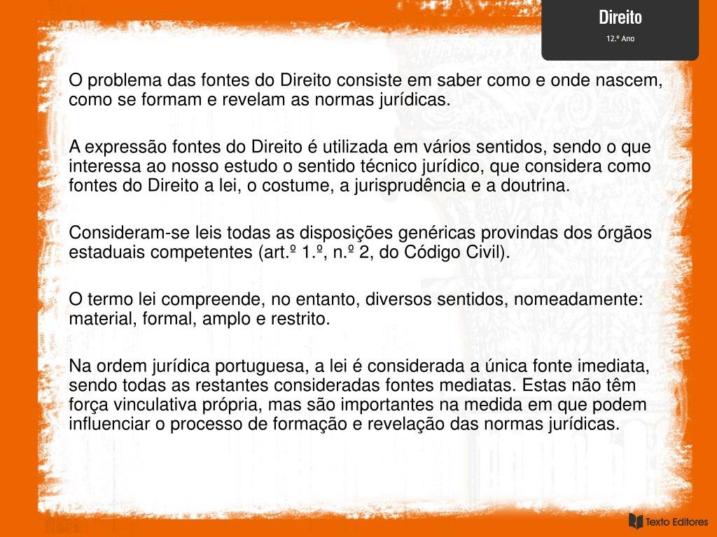 As fontes formais mediatas são os costumes, os princípios gerais do direito, a jurisprudência e a doutrina. Por seu turno, fontes materiais são os elementos . O costume, enquanto prática social reiterada e generalizada, assumida convictamente como obrigatória, não traduz um processo intencional de criação do direito, . Da lei de introdução ao código . Fácil é perceber que o critério definidor de fonte formal do direito é a sua forma positivada.